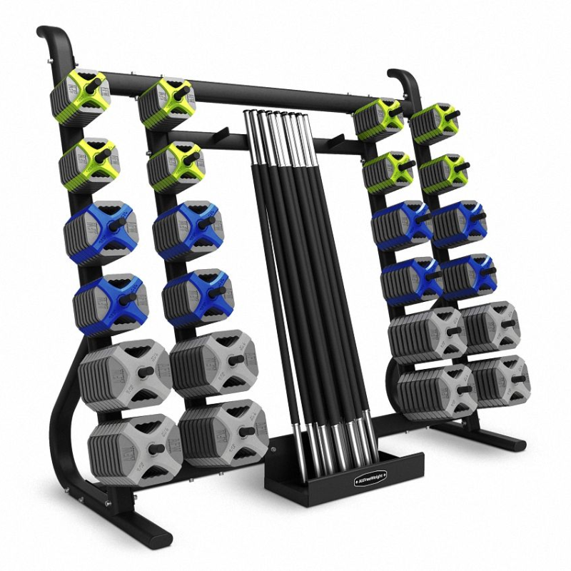 - El Rack Set Pump de AFW te ayudará a organizar tus barras y discos de forma eficaz y cómoda.