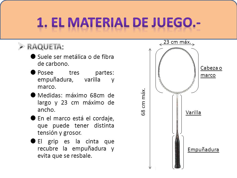 La raqueta de bádminton requiere una serie de medidas que deben ser cumplidas para que sea valido para el jugador participar en alguna contienda.