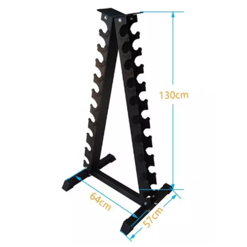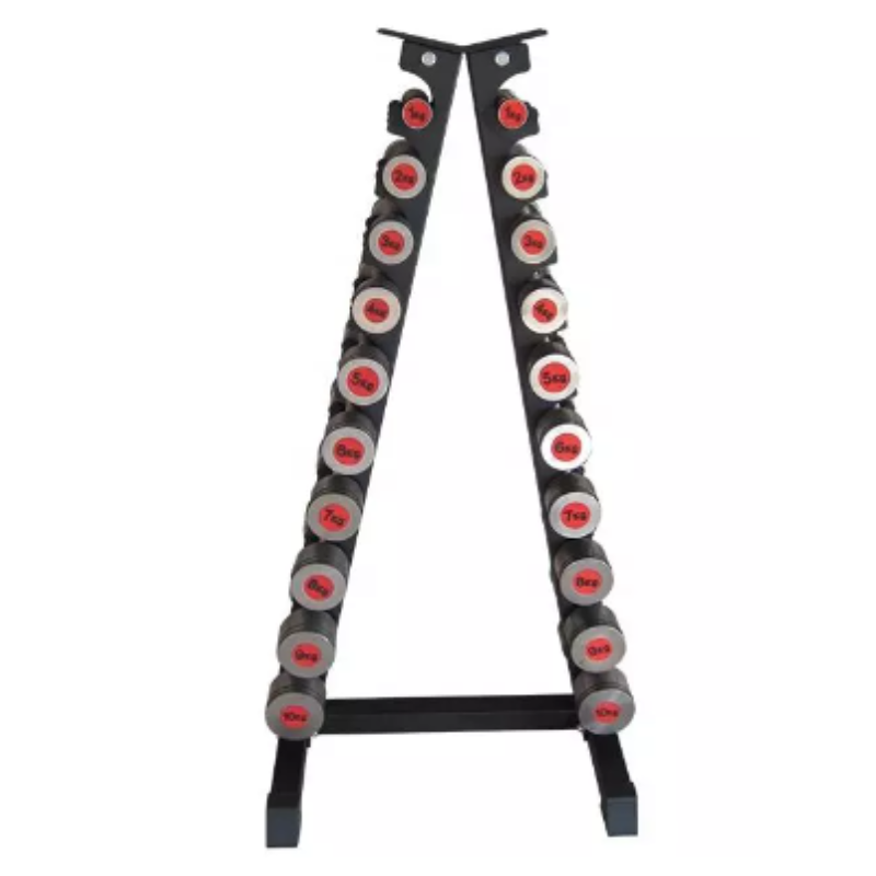 Soporte para 10 pares de mancuernas diseñado para almacenar y organizar eficazmente las mancuernas.
