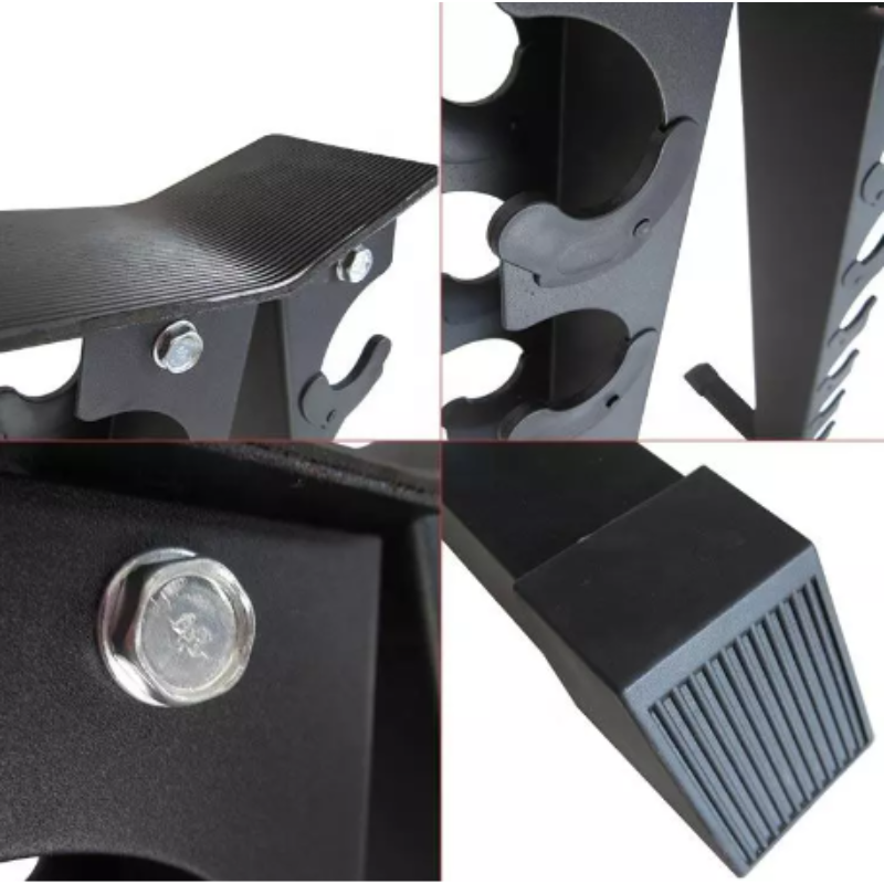 Estructura resistente con varios niveles o estantes, cada uno diseñado específicamente para alojar un solo par de mancuernas. Esta configuración permite una organización óptima dentro de un gimnasio o espacio de entrenamiento, asegurando un fácil acceso a una variedad de pesas para los usuarios que participan en rutinas de entrenamiento de fuerza y ejercicio.