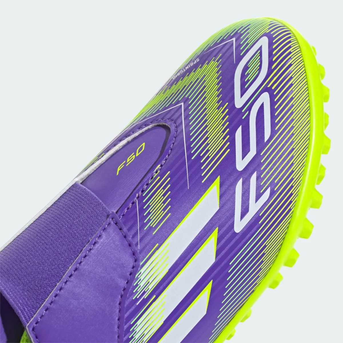 Encuentra tu rapidez para realmente expresarte en el campo. Siente la adrenalina con los zapatos de fútbol adidas F50, hechos para correr. Estos zapatos de fútbol Club para niños te mantienen cómodo cuando estás en movimiento, con un exterior de material sintético texturizado y una tira ajustable de cierre por contacto. Dales la vuelta y encontrarás una suela de caucho con taches que favorece el juego rápido sobre césped