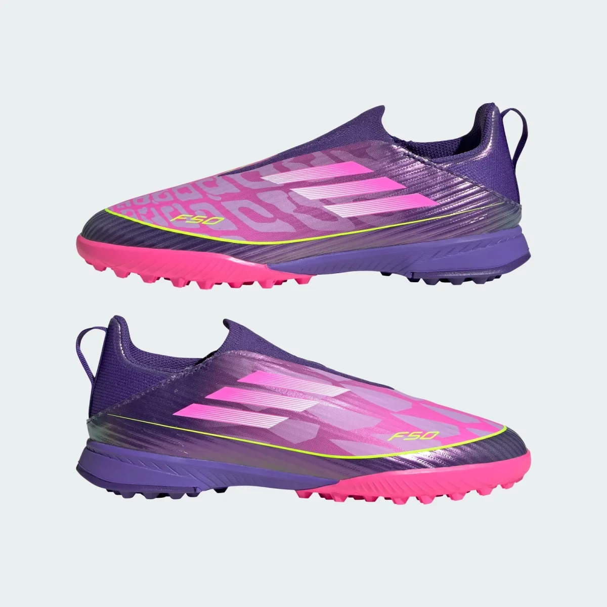 Cuando se trata de fútbol, la velocidad lo es todo. Los zapatos de fútbol F50 League Laceless para césped artificial están diseñados para ayudar a los jóvenes jugadores a desarrollar todo su potencial en el campo de juego. El exterior Fiberskin presenta un paquete de materiales de ingeniería que ofrece soporte y tacto suave con líneas 3D estratégicamente colocadas. El estampado Sprintgrid 2D del refuerzo emula visualmente el elemento de diseño de los productos en los niveles de precio más altos. El cuello sin cordones presenta un cómodo cuello de punto con refuerzo de TPU para mejorar la sujeción del pie a altas velocidades. La Sprintplate 360 ofrece detalles basados en TPU con ADN de diseño F50 y una suela con un núcleo que se encuentra en los niveles de precios de gama alta. Con doble marca, incluidas las 3 Tiras impresas a ambos lados del mediopié y un logo de F50 en el antepié, estos zapatos de fútbol son tan elegantes como funcionales. adidas sigue superando los límites, ayudando a los jóvenes atletas a alcanzar sus objetivos de rendimiento.