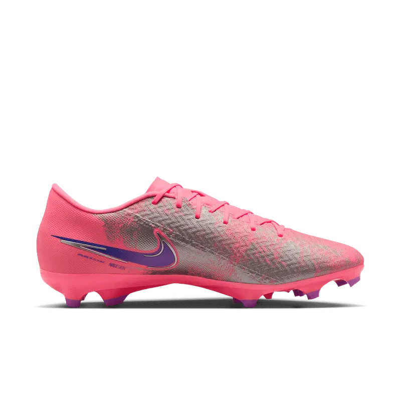 Para asegurar una respuesta explosiva, incorporamos una unidad Air Zoom en el talón integrada directamente en la placa de tracción, combinada con estoperoles en un patrón de onda que muerde el terreno cuando más necesitas arrancar. Además, hemos perfeccionado el ajuste reemplazando la malla anterior por un tejido adaptable que se mueve con tu pie, brindando soporte y un toque mucho más preciso con el balón.